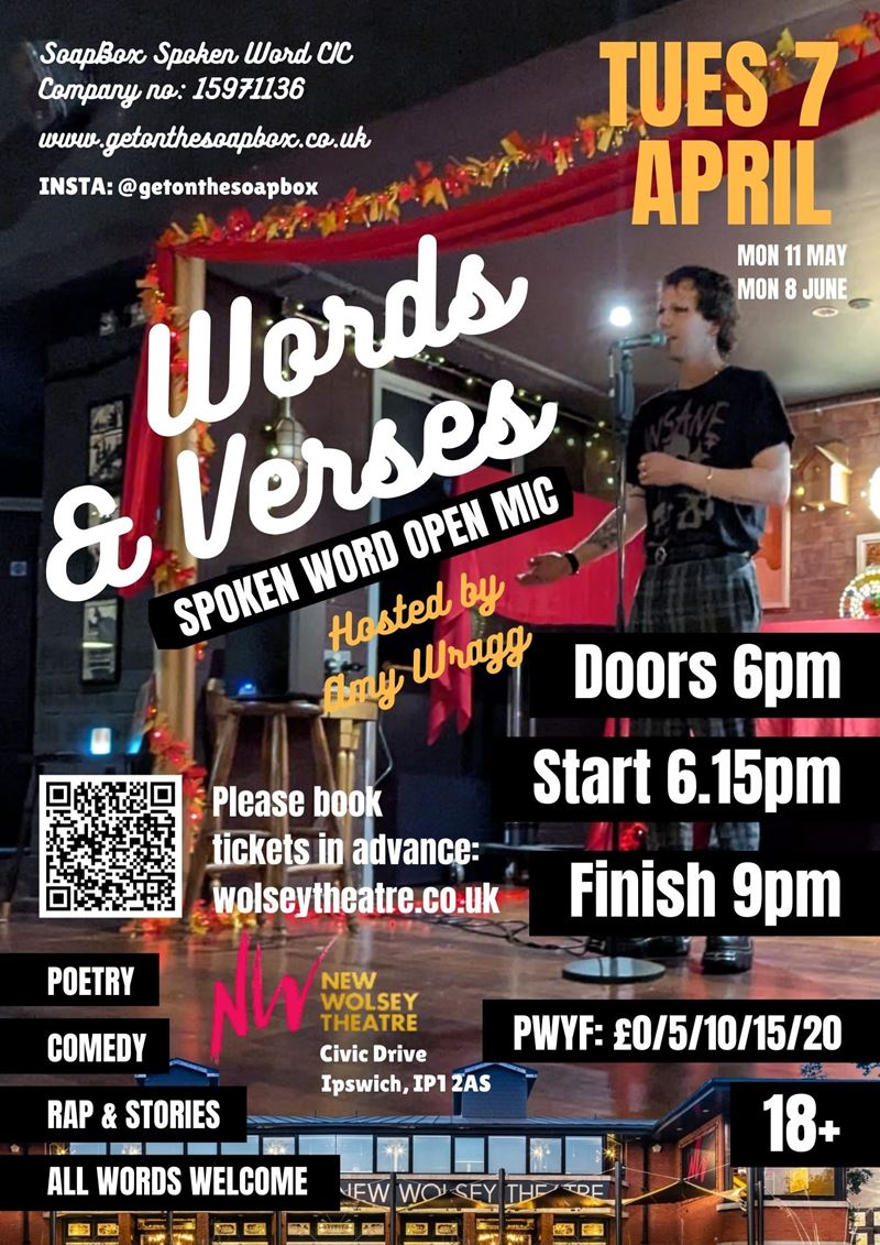 The event is run on a 'Pay What Your Feel' basis, with all income going to support our local communities. The New Wolsey Theatre is a registered charity, and SoapBox Spoken Word CIC is a legal non-profit organisation (CIC). The options are: £0/5/10/15/20. We have always championed socio-economic diversity and access to the arts for all budgets (and none), so please choose whichever option works for you.
