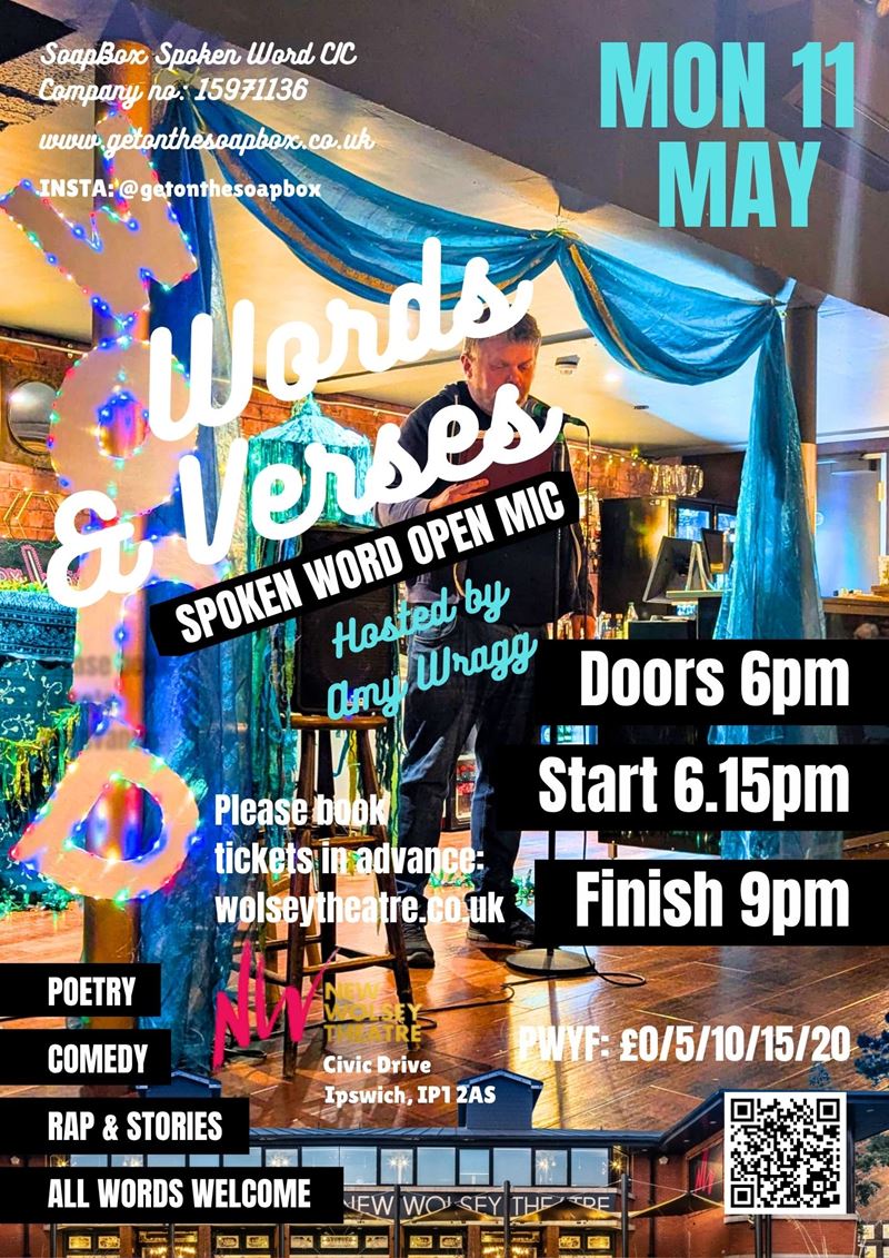 The event is run on a 'Pay What Your Feel' basis, with all income going to support our local communities. The New Wolsey Theatre is a registered charity, and SoapBox Spoken Word CIC is a legal non-profit organisation (CIC). The options are: £0/5/10/15/20. We have always championed socio-economic diversity and access to the arts for all budgets (and none), so please choose whichever option works for you.